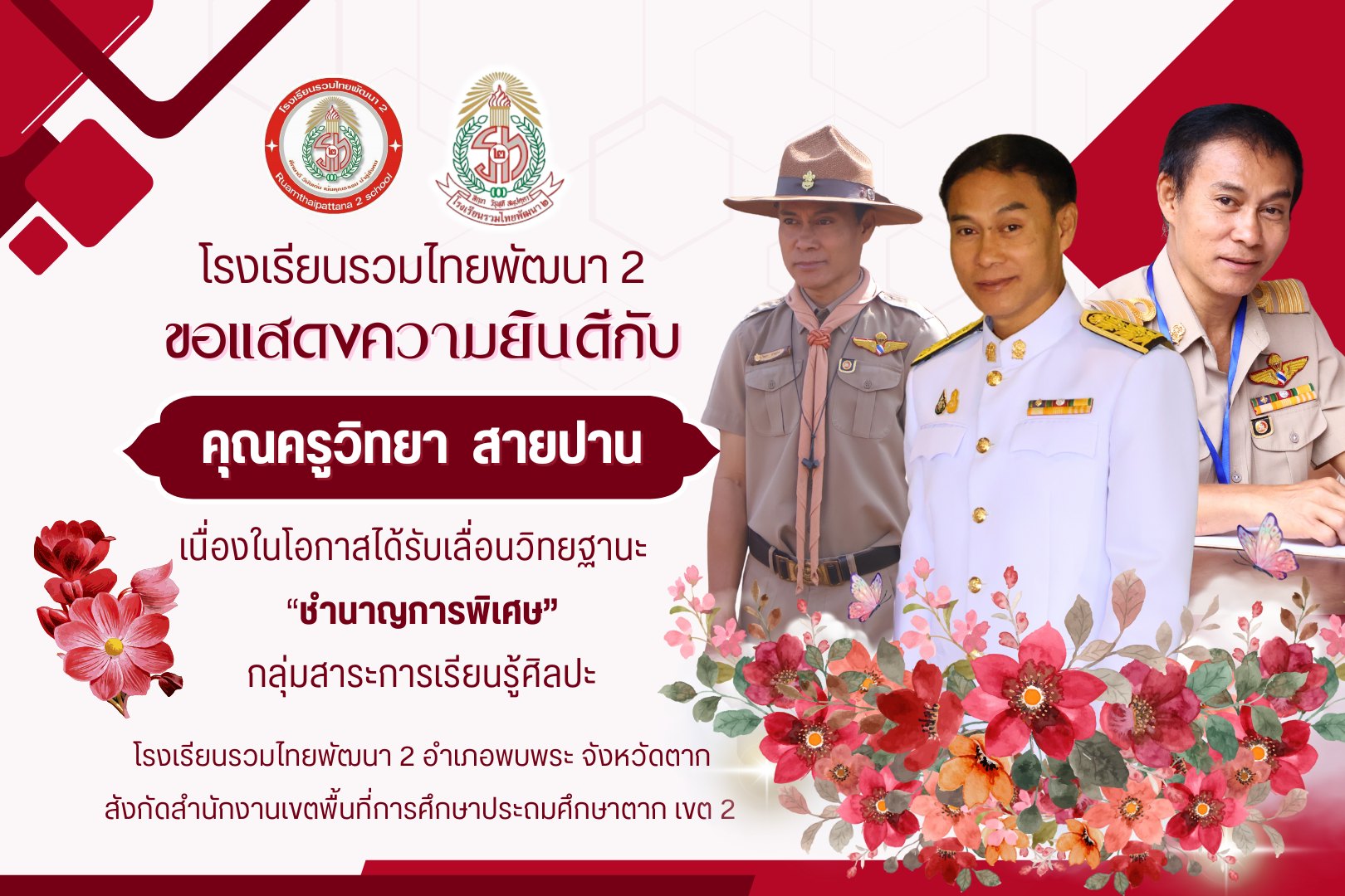 โรงเรียนรวมไทยพัฒนา 2 ขอแสดงความยินดีกับ คุณครูวิทยา สายปาน เนื่องในโอกาสได้รับเลื่อนวิทยฐานะ ?ชำนาญการพิเศษ? กลุ่มสาระการเรียนรู้ศิลปะ