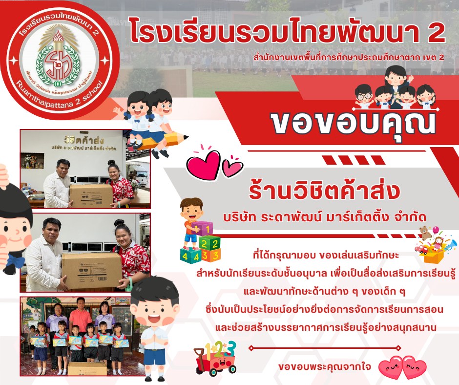 โรงเรียนรวมไทยพัฒนา 2 ขอขอบพระคุณ ร้านวิชิตค้าส่ง" ที่ได้กรุณามอบของเล่นเสริมทักษะสำหรับนักเรียนระดับชั้นอนุบาล